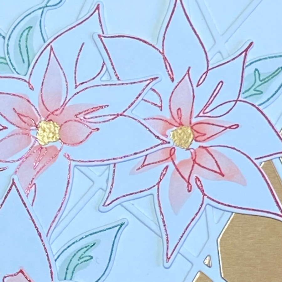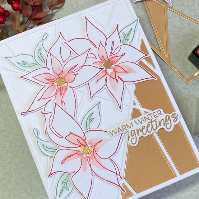 The inspiration for this card came from the beautiful coordinating set of stamps, dies and stencil that I treated myself to from Altenew before the holidays – Linear Life Poinsettias. I loved the modern design of the stamps. I thought the stencil, with it’s offset design, would surely stretch my comfort zone! Although I started with the Poinsettia set for this card, I had no idea what I was going to do as a design until I participated in this class with Jaycee.