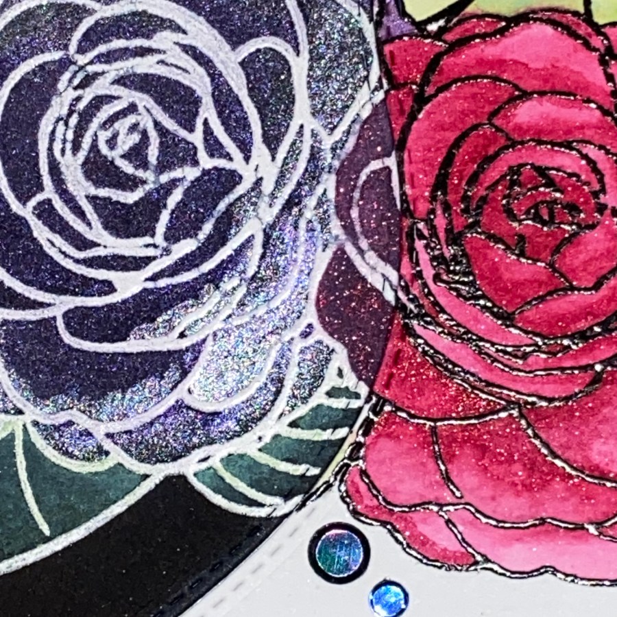 I had a harder time with the black watercolor paper than I expected. First off, whether I used VersaMark Ink with White Embossing powder, or used White Pigment Ink with Clear Embossing Powder, it seemed like the paper sucked up the ink too fast, and I couldn’t get a good layer of the embossing powder to stick. This definitely became a learning experience! You might notice the white outlines on the black paper are kind of splotchy. The Perfectionist in me spent a good hour trying many differnet combinations to get the best coverage. I’m still only marginally happy with this one. What worked the best for me in the end was to stamp with White Pigment Ink, and quickly add Clear Embossing Powder, and heat set. I used a stamp positioning tool so that I could do this TWICE, on top of each other. Then, I cleaned off my stamp, applied some anti-static powder to the black paper, stamped the image with VersaMark Ink, and then added White Embossing Powder. Phew! Maybe in hindsight I should have tried regular black cardstock so the embossing might turn out better, and then see if I could use the mica sprays to color in the flowers, without getting the paper too wet.