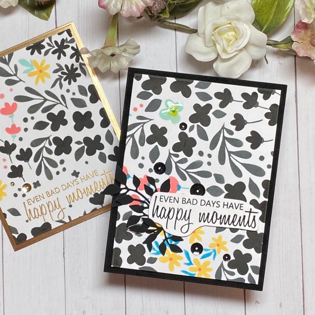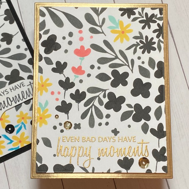 To finish up the first card, I used a bit of Glossy Accents over a blue flower to highlight and focus on that flower. I stamped a sentiment from the Altenew Bad Days Happen Stamp Set. I felt like I wanted that one blue flower to really stand out, so I added some black die cut leaves (from a different brand) behind the sentiment, and a few black sequins.