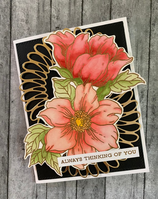 Hello creative friends! Today I’m sharing a card that I made after participating in Altenew Academy’s One Stamp Six Ways online course, instructed by Justine Hovey. I took this class as part of my Altenew Academy Level 3 certification. The idea of this course is to find different ways to imagine the same stamp (or die, focal point, etc) into six different, unique card designs. Justine demonstrated six different ideas using the same stamp, Vintage Garden from Altenew. It is a beautiful set! The main stamp is two different flowers and a couple leaves. I found a stamp set in my stash that was similar, the Paint-A-Flower: Camellia Waterhouse set.