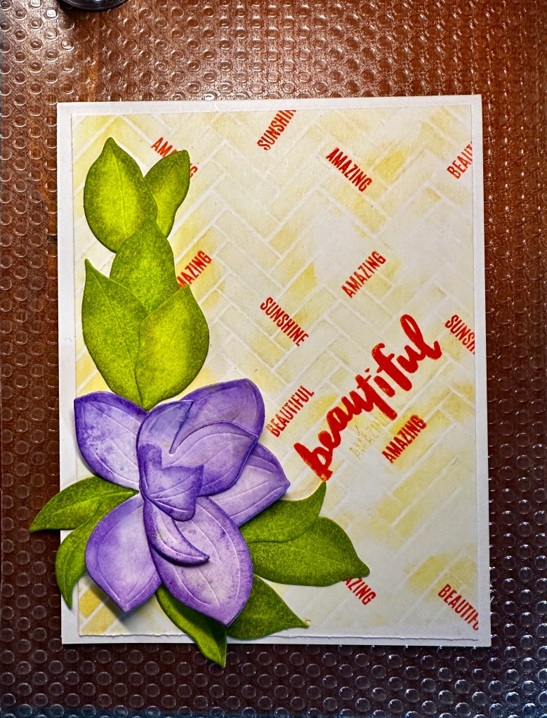 I love the coloring that Ann added on her card to her flower! Absolutely gorgeous! I new would have thought to use purple to lowlight the edges of the leaves. I don’t remember the name of the stencil she used, but I heard it was discountinued. I’m definitely going to look for it! It looks like she used a top fold card, and also cut away the front of the card, leaving the flower to overlap. Nice detail! For her second card, she kept with the straight theme of her stencil instead of curving the smaller text that she repeated.