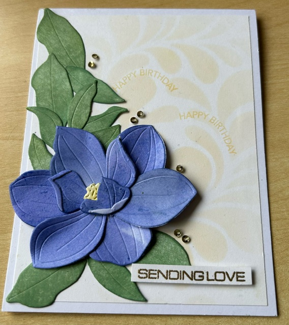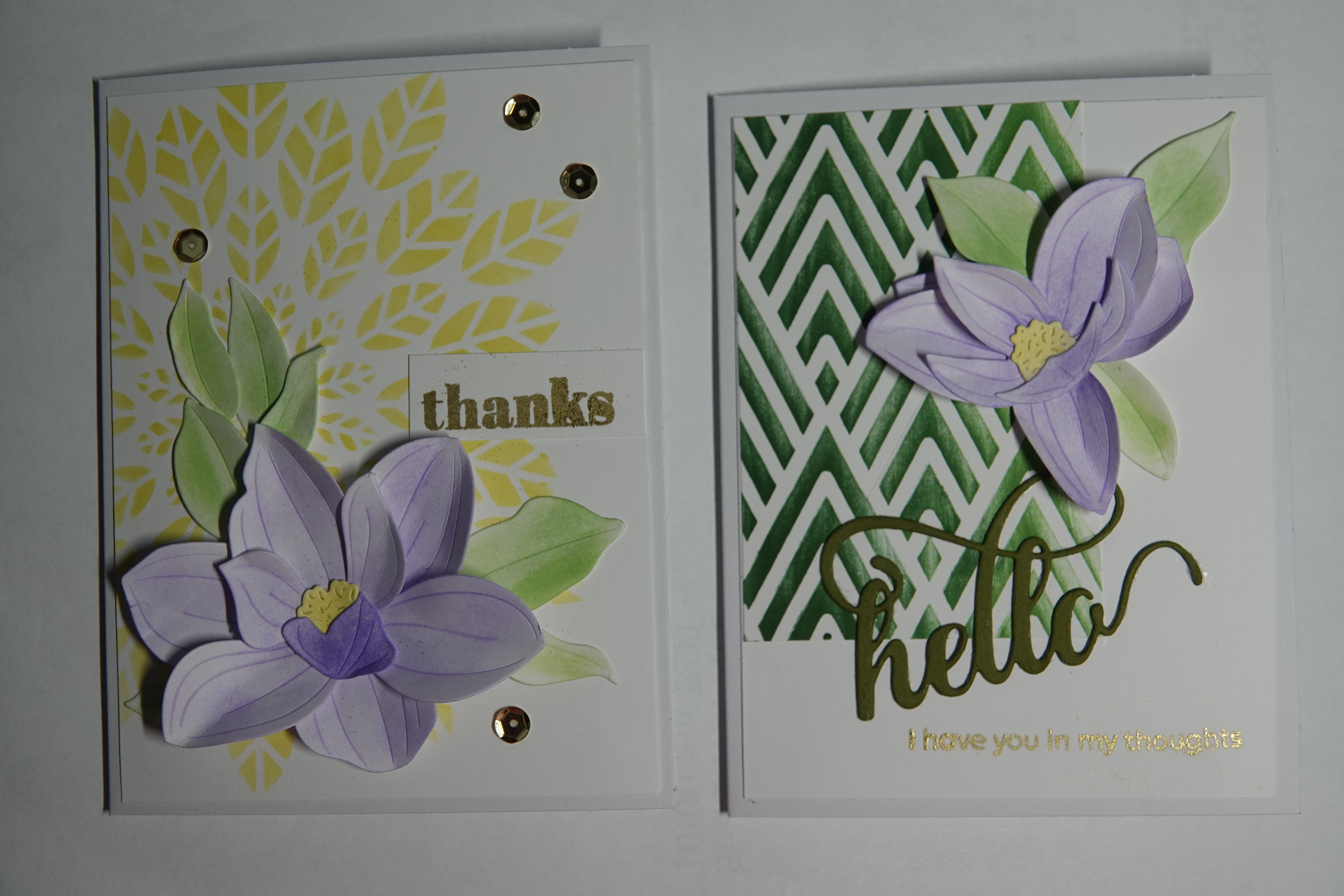 These two cards were created by Helen. She used the Altenew Flowing Drops Stencil, and the Craft-A-Flower Southern Magnolia Die Set. The geometric stencil gives me the feeling of a slate walkway! I love her choice of using blues for the flowers. These are beautiful birthday cards. I could also see using this color combination for a Thinking of You card… very peaceful and calm. She did a great job following along with my design!