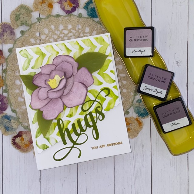 I know with our crazy economy, it’s not all about just using the newest products, but I really HAD to have the Gardenia Layering Die Set! The flowers were so lovely, I could almost smell them! So I thought – ok, I’m gonna splurge… maybe one of the themes to my workshop could be stretching your supplies, using the same supply in different ways, using a product in a potentially new way. And I didn’t want my attendees to feel like they had to buy a lot of product to come to my workshop. Along with that, I purposefully only used white paper, and inks to color it. I said that any Altenew layering die set would work, and any stencils.