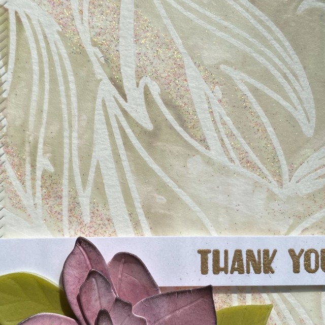 I was surpised at the color of the Grape Agate when it dried. I’m sure it was because it was so diluted by the paste. But in person it really is a gorgeous taupey color that highlights the glitter and blends with the flower. This extra card turned out to be my favorite of all!