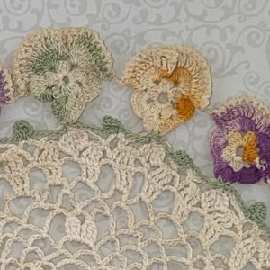 I started to prepare for the workshop by creating an idea for a card. Let’s start with the inspiration for these cards… a vintage doily that I believe Great Aunt Ruby (1887-1986) would have made. That was my Grandmother’s father’s sister. I guess doilies are out of fashion, and not my style anymore, but I do treasure this keepsake that reminds me of my Grandmother, and visits with Aunt Ruby. I used three of the colors to select my inks. I chose to use the Altenew Crisp Dye Ink mini cube sets in Summer Afternoon (yellow and tans), Sugarplums (purples), and Tropical Forest (greens). I also like the way the pansies on the doily are made to ruffle, so I wanted to do something a little similar on my cards. I chose to do some paper sculpting with an optional paper sculpting kit. Optional, because fingers work just as well!
