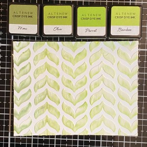 To begin with, we started the card with the texture paste background so that it could dry. If you are using paste in your own workshop, or anything that needs drying time, remember to do it first. This was create by pouncing 3 or 4 different color minicubes on top of the stencil in strips (top to bottom in this photo). Inks were added from darkest ink to lightest ink on top of the Leaf Drops stencil. Then we taped a piece of cardstock underneath the stencil and applied Altenew Texture Paste (using a palette knife) on top of the stencil in the same direction as your strips of ink, in one pass.