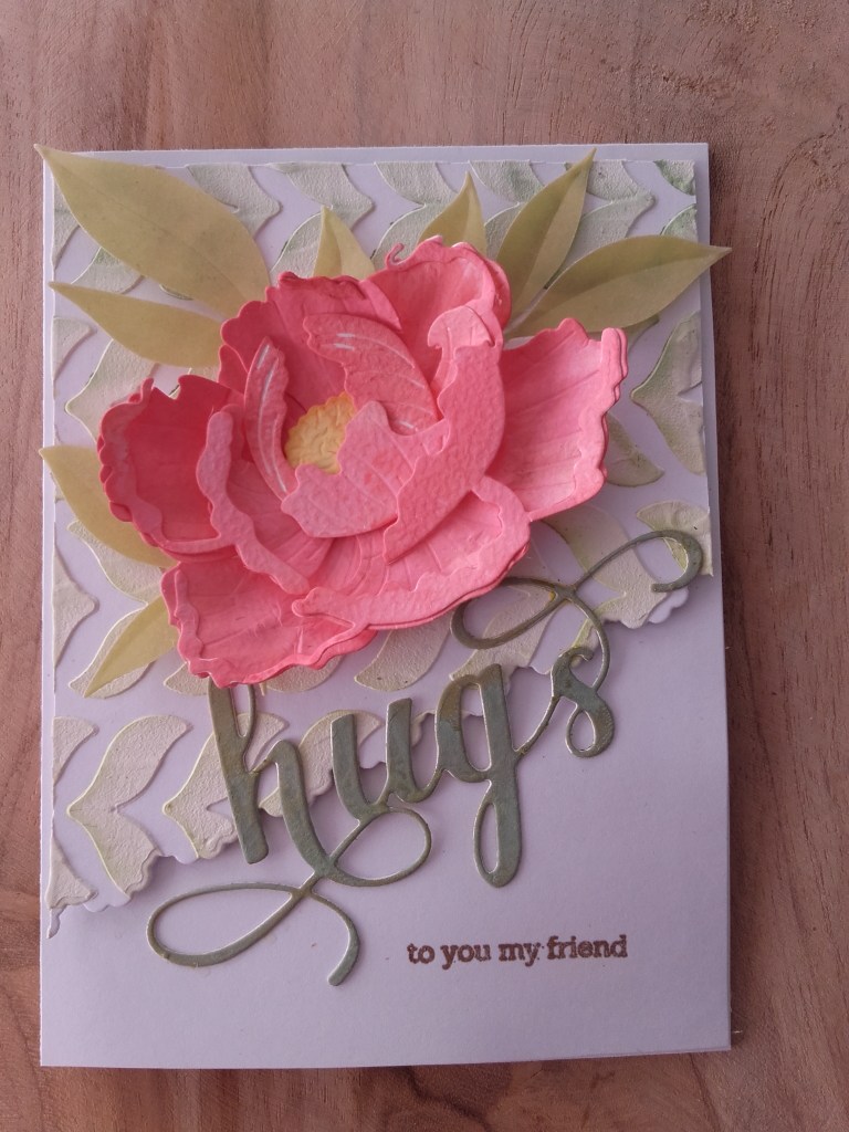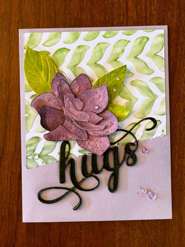 An hour had passed, and it was time to move to the second card with the embossing paste. Mine still wasn’t dry! I live in Virginia, and in the summers, the humidity is usually as high as the temperature. 90 degrees? 90% humidity! Anticipating this, I had made another background with embossing paste the day before, that was dry. See that cute scalloped cut on the edge, behind the hugs sentiment? That was from a random rectangular die. I just used one side of it to cut the line where I wanted it. The rest of the card was very much the same to put together, except the leaves. For the leaves, I used a dark green Distress Oxide Ink on a piece of vellum, then layed another piece of vellum on top, making a vellum sandwich if you will. This keeps the ink from smearing around until it dries, which in Virginia, can take precisely forever and a day. I placed the leaf die cuts on top of the vellum, then cut them out as a sandwich. That keeps your cutting machine and dies clean too. Plus it gives more dimension when you add it to your card like that.
