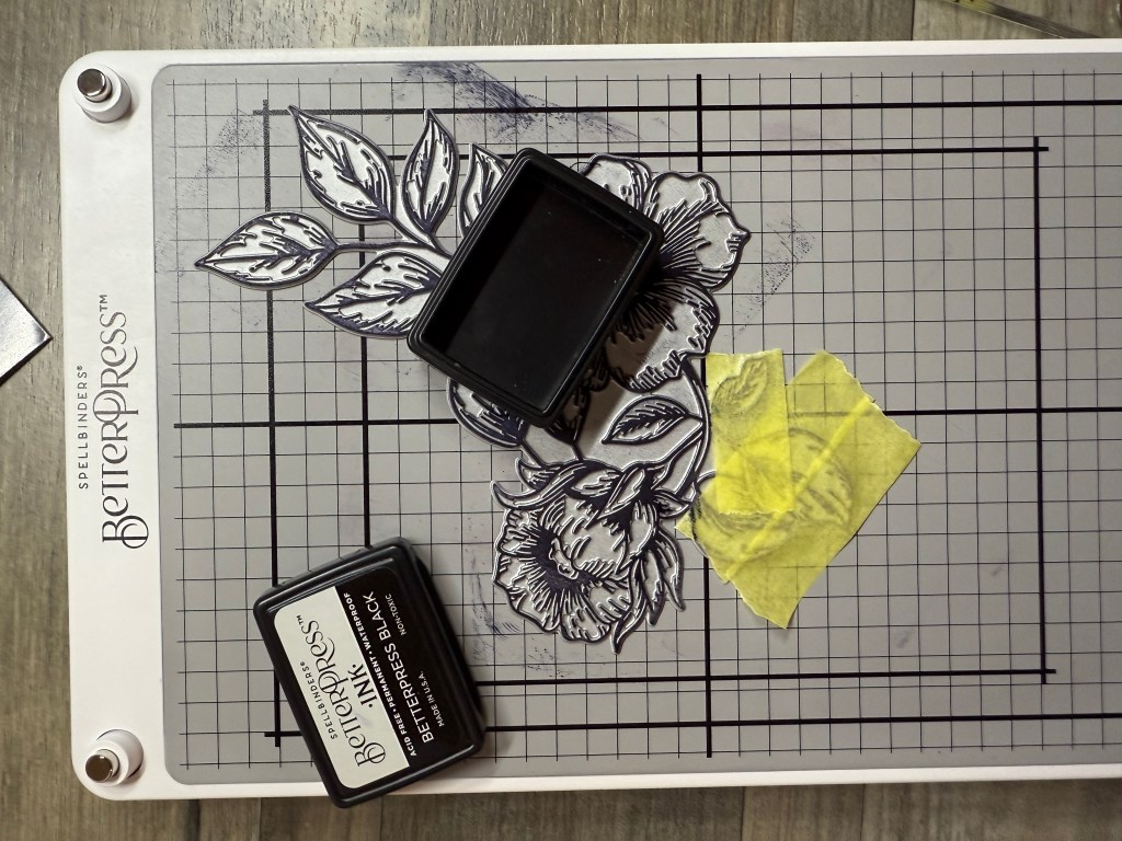 I purchased the Spellbinders BetterPress System for myself for Christmas this year, and the Altenew Blossoming Bouquet Press Plate was the first press plate I purchased. I wanted something that would really highlight the beautiful, crisp image transfer that this system offers. I knew I wanted a floral, so Altenew was my first choice. They do florals the best in my opinion! I had the idea to mirror the pattern, filling most of the card with the deisgn. This led me to choose a larger, 5×7 format for my design. It took me some trial and error to get the pattern to repeat exactly how I wanted it. I used a piece of paper to cover up the part of the pressplate that I didn’t want to transfer, and tried to stop rolling it through my Sizzix BigShot diecut machine in the right spot, at the halfway point. I anticipated using some kind of a band in the middle, possibly a sentiment strip, to cover up where the two images would meet, so it didn’t need to be perfect.