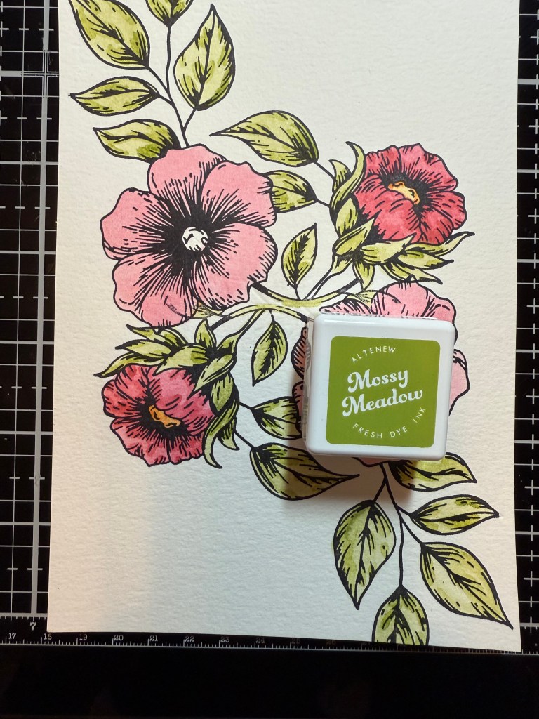 I love how the Altenew inks coordinate so easily with each other. I chose the Blushberry Bliss Fresh Dye Ink Mini Cube set for the flowers, using the lightest 3 colors on the larger flowers, and the darker three on the smaller flowers.