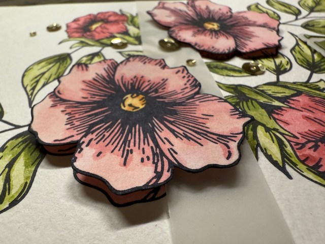 You can see that this gold paper has a brushed finish to it, adding another touch of texture. To add the element of form, I used two different thicknesses of dimensional foam squares for the flowers and sentiment, and liquid glue to attach the leaves to the card front.