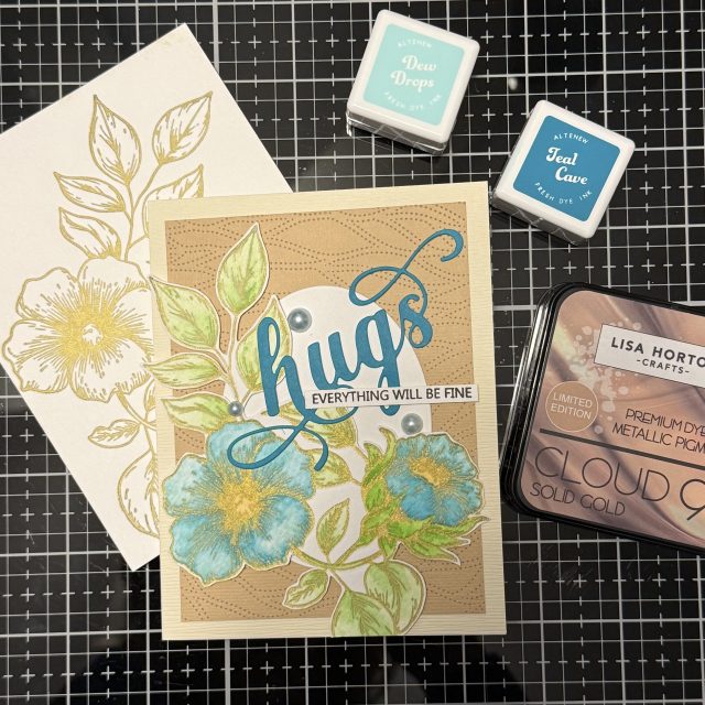 I used Dew Drops and then Teal Cove to watercolor the flowers. The method I used was to press the mini ink cube onto my craft mat to squeeze out some ink, pick up the ink with a waterbrush, and then paint the flowers. The center of the flowers were colored with Peachy Glow. For the leaves, I used Grass Green and Firefly. After I finished coloring the flowers and leaves, I reinked the press plate, still in place in my BetterPress base, placed the cover plate on top (with the watercolor paper still taped in place) and ran it through my die cut machine again. This restamped the gold ink, making the outline crisp and clean again after the watercoloring.