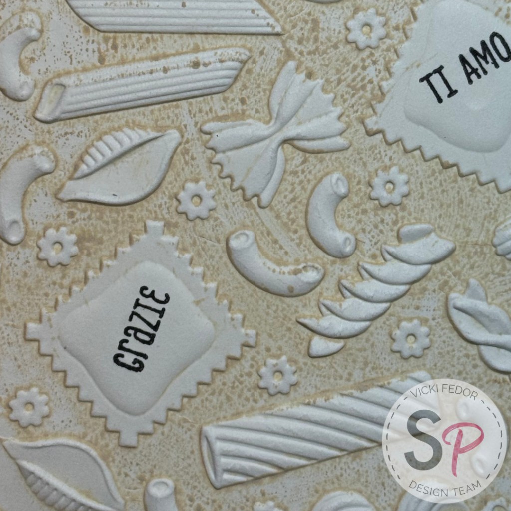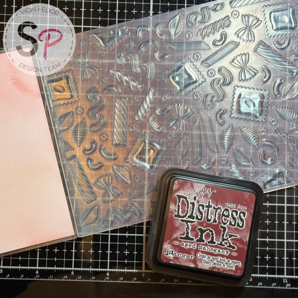 As I was contemplating my design, I decided I wanted the pasta shapes on the Spellbinders Al Dente folder to be more of a pasta color, and the background to be darker. To achieve this effect, I planned on inking the flat side of the embossing folder… the side where the shapes are depressed into the folder. This would place the ink on the background, and keep the pasta shapes the color of the paper. At first I tried this using cream colored cardstock, and inking with Tim Holtz Distress Oxide in Antique Linen. As I thought through the design, I decided I would rather have my little ravioli pasta friends be a pasta color, and have the entire background appearing to be tinged with marinara. Not to worry, I’ll use that first “practice” piece of cardstock for something else. On to the next idea… let’s get some variations in the marinara sauce. Starting with a piece of white cardstock, I used a large blending brush to apply Tim Holtz Distress Ink in Tattered Rose and Fired Brick. Then I inked the embossing folder with Aged Mahogany, and ran it through my die cut machine.