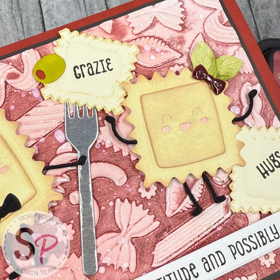 To add a little more interest to the card, I went back to that first piece of cream colored cardstock that I had embossed in the beginning but decided not to use. Some of the Italian words in the sentiment set were small enough to fit on the embossed ravioli pasta shapes. I stamped them onto the spare background that I made, and then fussy cut them out to add to the card. The raviolis and sentiment strip were attached to the card front using Scrapbook Adhesives Foam Squares Variety Pack and Scrapbook Adhesives Thin Foam Squares Variety Pack. I used Bearly Art Precision Craft Glue to add the arms, legs, hat, and other details. I created a thin black frame with black cardstock, and used Fired Brick ink to color the larger, red frame.
