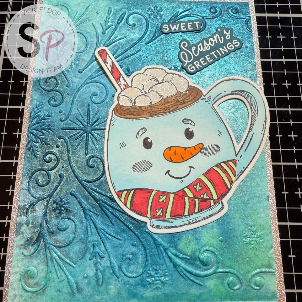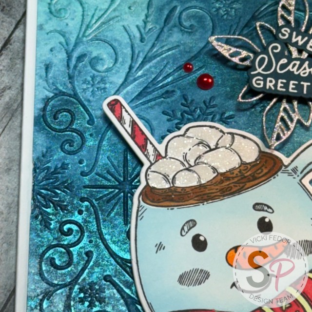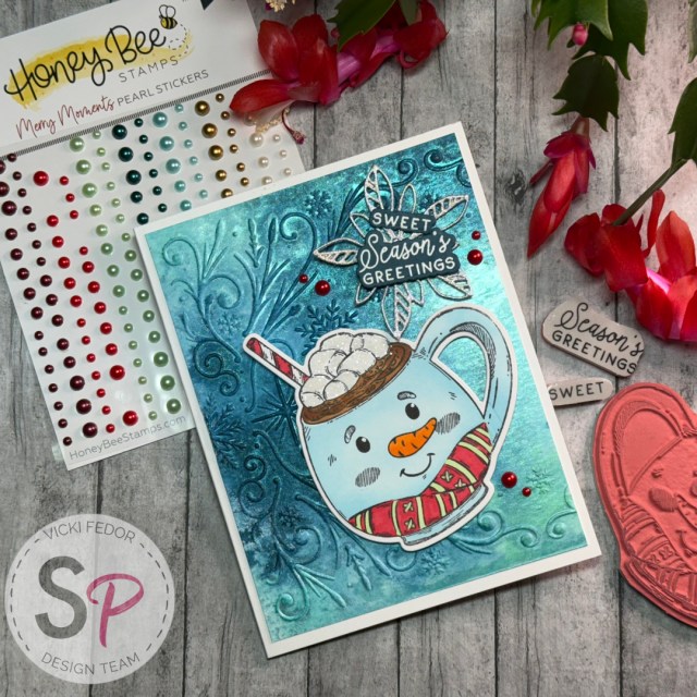 I also added a bit of clear glitter to the marshmallows – because – it’s the holidays! More glitter always! Now that my focal point was finished, I went on to the background of my card. I had also purchased the Honey Bee Stamps – 3D Embossing Folder – Frosted Filigree. This folder is soooo pretty and detailed. It’s a nice 5×7 size folder, but I wanted to stick to a smaller, A2 sized card. I realized that if I turned the folder sideways, I could get a 5 1/4 inch by 4 inch piece for the background with just a tiny 1/8 inch frame of the base card color. Still thinking glitter and sparkles, I reached for my Ranger Tim Holtz Mica Spray Stain swatches. When I purchased mine several years ago, they came in seasonal sets of 3 different sprays. Now, ScrapbookPal sells them individually! And, at the typing of this post, they are ON SALE! I again went to the Honey Bee Stamps – Pearl Stickers – Merry Moments for color inspiration, and chose the Distress Mica Spray Stains in Frosty Mint, Wonderland, and Juniper Berry I highly suggest making swatches of all of your sprays, especially the mica ones that look different when they are settled out on your shelf than they do after you shake them up and spray them. I never used to use my Mica sprays until I swatched them!