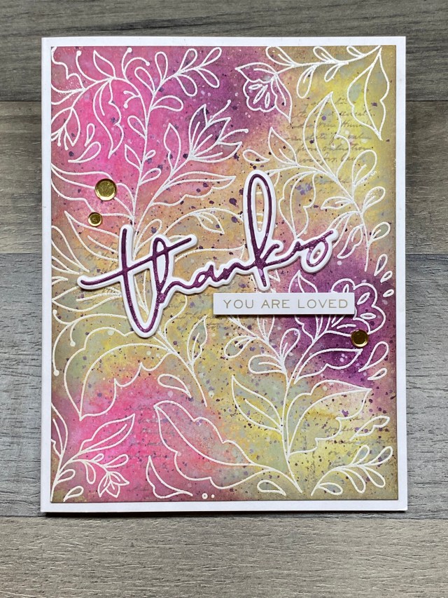 I was really happy with the way the background came out. I didn’t want to detract too much from it, so I thought just a nice, small, thin sentiment would be great. Yana’s Layered Script Sentiments from Spellbinders came to mind. I quickly colored and dried a piece of watercolor paper, using seedless preserves spray stain. I die cut the word “Thanks”, and three shadows in white heavystock cardstock (to layer for some depth). I didn’t take any in-process photos, because this was just a “fun for me thing”! I hope my directions are clear enough for you to follow along! I added three gold confetti sequins, and called it done! Thanks for stopping by!