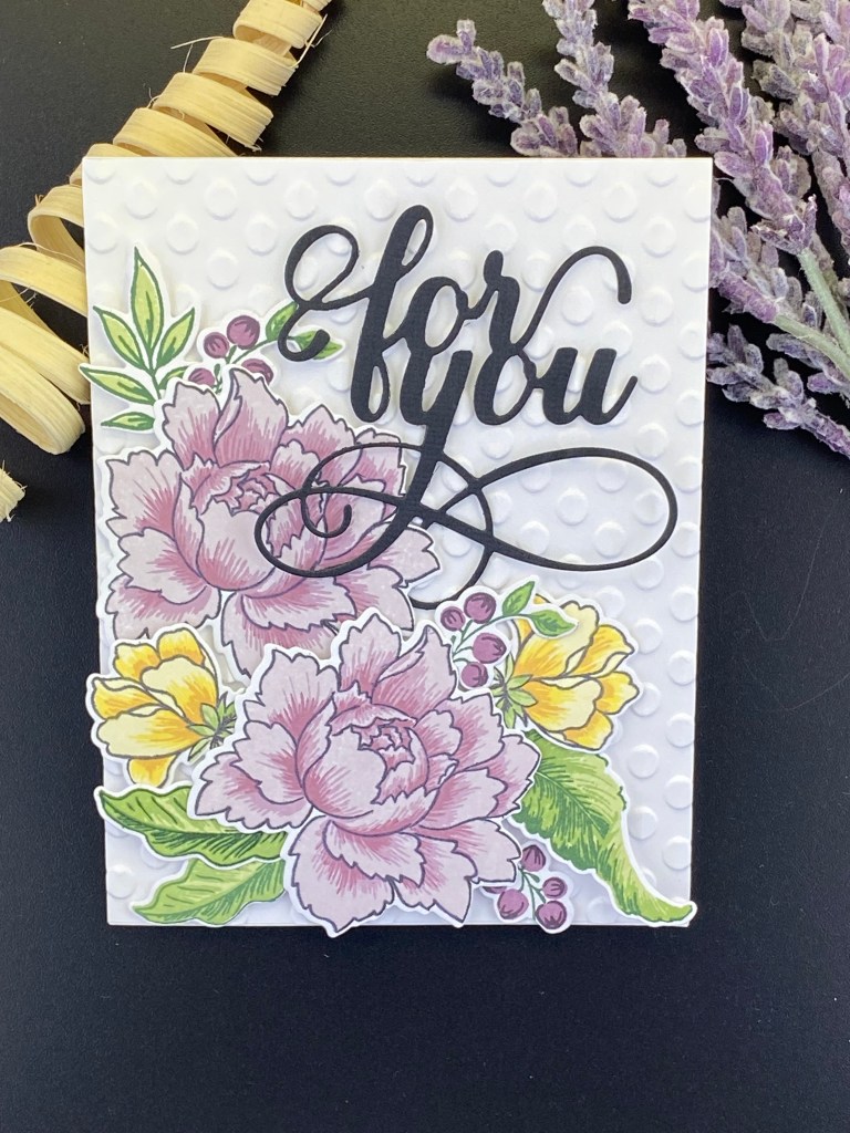 I was inspired to make this card for my sister-in-law’s birthday. She’s elegant but down to earth, and is an interior designer. I knew she would appreciate these lovely flowers, and I wanted the card to be elegant and detailed. I chose purple because it was an accent color in a room she helped me decorate. Some of the techniques that I used from this course was to arrange the leaves in a triangle around the flowers, and to use an odd number of flowers in the arrangement. While there are two large peonies and two buds, I used the purple berry clusters to achieve this odd number of flowers. Another technique that was highlighted in the course was to use a large die cut shape in the background for a white-on-white effect. Instead, I used the Playful Circles 3D embossing folder. I was mindful in layering the pieces before adhering anything to the card, another point which was emphasized in the course.