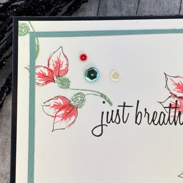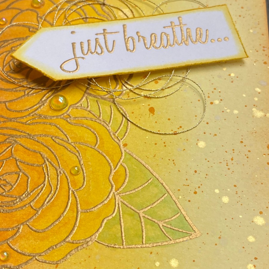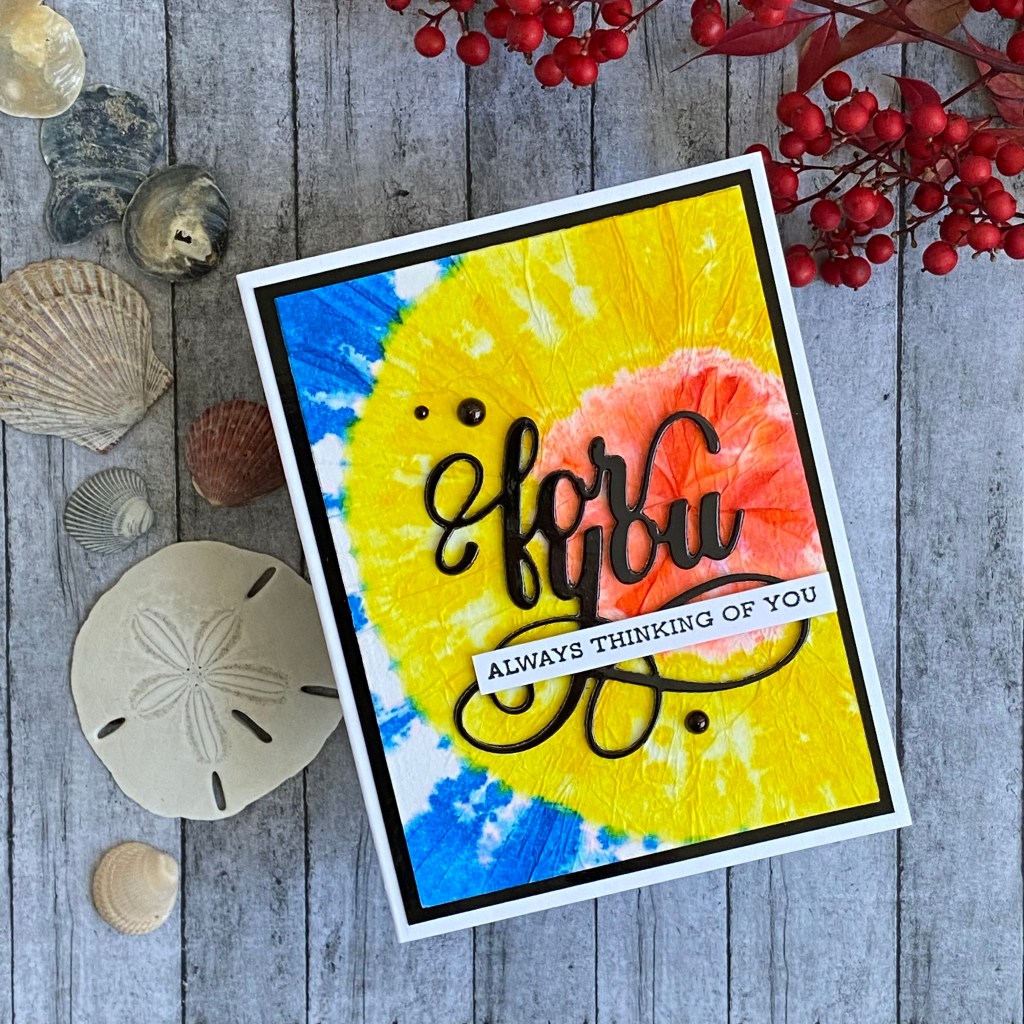 I started with my Thinking of You themed card. I’m not sure why, but when I think “masculine”, I often think of tie-dye. I had made a tie-dye card a few years back, using a coffee filter, and alcohol ink. I folded a round coffee filter in half, and then rolled it up into a tight cone. I tied it using a couple rubber bands, and then carefully painted 3 different colors of alcohol ink. It’s not true tie-dye, but it looks close enough, and it was fun. After my coffee filter dried, I used collage medium to adhere it to a card panel. The tie-dyed filter has some wrinkles and texture in it, so I chose a glossy black cardstock for the sentiment as a contrast. I also cut the Fancy For You sentiment two more times out of black watercolor paper to stack up and give the sentiment some dimension. The sub-sentiment is from the Sentiment Strips 3 stamp set. I used a black Copic sketch marker to color a few half circle embellishments black, and added them to the card as well. I layered the front panel on another piece of shiny black cardstock before attaching it to my A2 card base. The main class that I referenced to help create this card was the Color Your Day class. I love the instructor’s suggestion of thinking about colors in the 70-20-10 portions – 70% of the main color, 20% of a complimentary color, and 10% of an accent color. I also love that she said it was “about” those proportions. Noone is going to call you out for 68-17-15. There are no color proportion police, at least not where I live. It’s a good starting point for sure. I did hold back on this card, and kept it to 3 colors plus black and white.