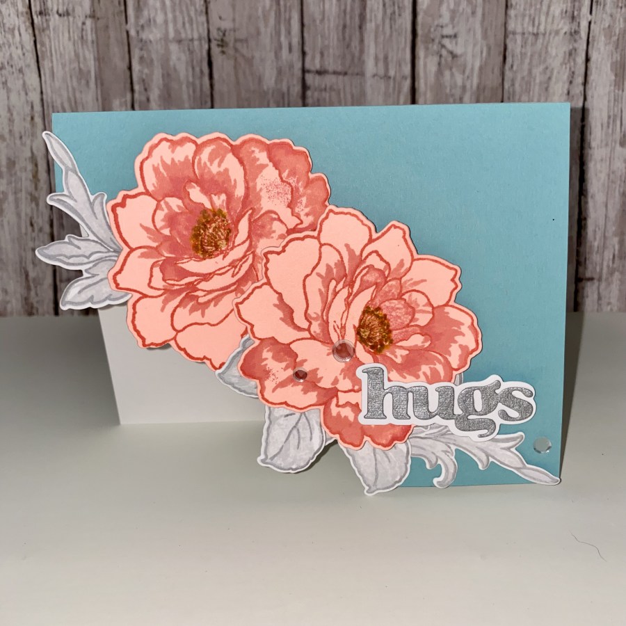 I have some really cool paper that is actually very thin wood. It’s called wood veneer cardstock. I’m sure several different suppliers make it. If you decide to look for it, make sure it is called cardstock somewhere in the name, so you know you can cut it like cardstock. It doesn’t fall apart as I thought it might, being so thin. I knew it would be perfect for the oars. You can also use ink to color it. For this card, I wanted the details to matter, and I was inspired by the Beautiful Details class. In the class, the instructor used beautiful coloring and painting techniques to add gorgeous details to her cards. That it not really my forte, so I went with what I prefer, which is beautiful details in a mixed media sense. On this card, I used the wood veneer for the oars, I added a jewelry jump ring to appear to hold the red and whiite rope (another beautiful detail) to the bow of the boat, and I made a post out of woodgrain paper cardstock to look like an algae covered aged post in the water, anchoring the boat safely in the harbor. I colored the wooden post with Distress Vintage Photo Ink, then used Distress Crayons to darken the grain and add some green algae at the water level. I cut a small slit in the background to insert the botton of the post into, to make it look like it was coming out of the water. The sentiment is black ink with clear embossing powder on the same speckled grey that I used in the boat. The card panel was attached to an A2 cardbase with dimensional foam tape.