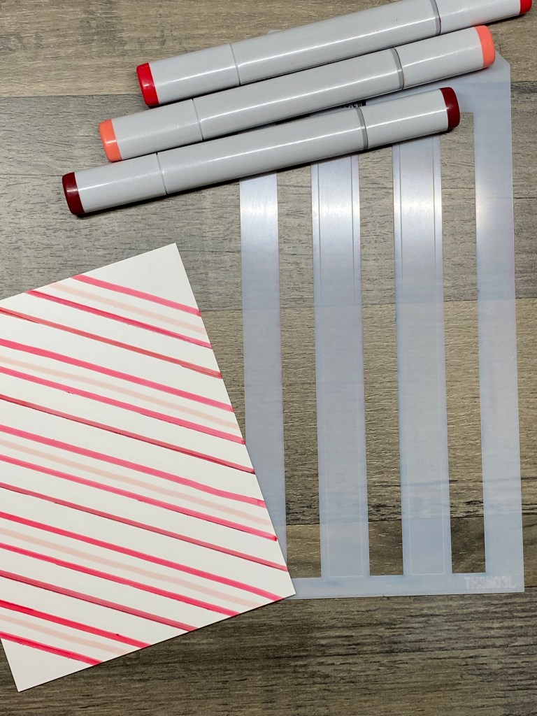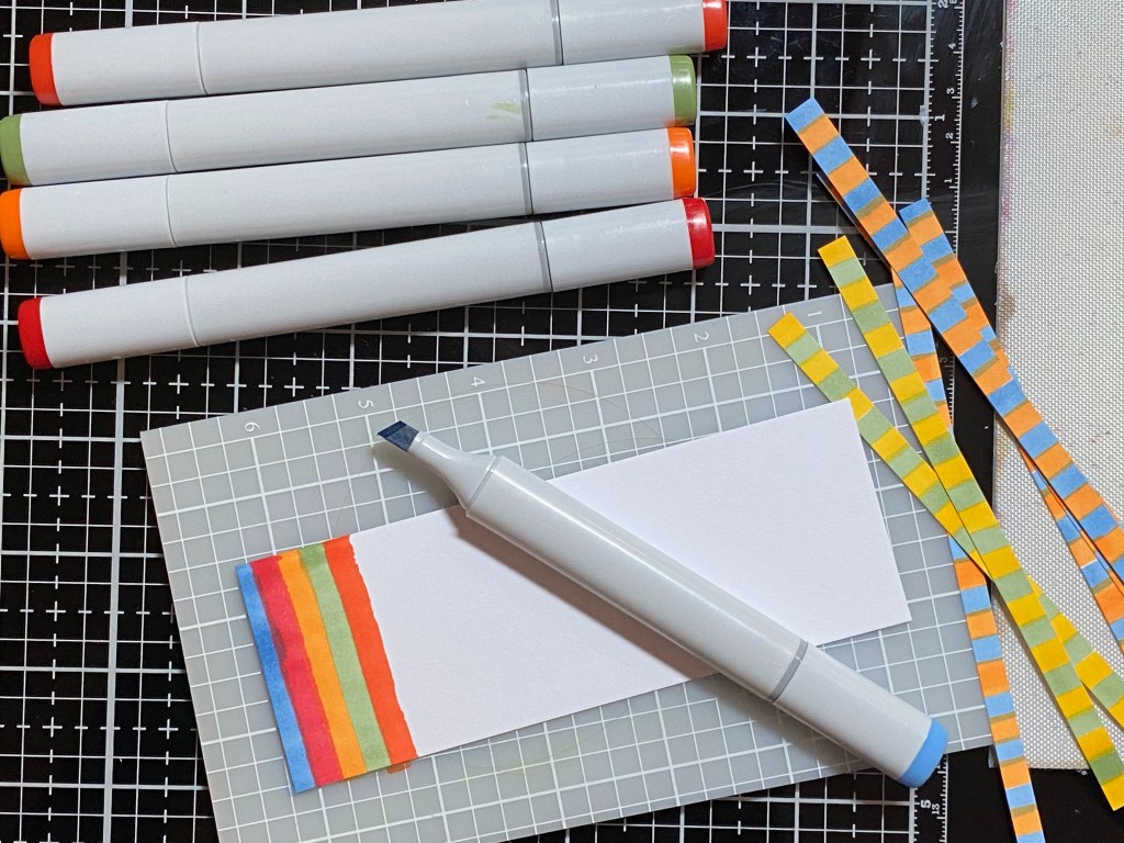 For my Happy Birthday themed card, I was inspired by the Magical Marker Techniques class. I have a bunch of Copic Sketch markers, but I’m not really into coloring stamped images with them. I’m not very good at it. I need to focus on practicing to get better. In the mean time, the Magical Marker class got me thinking about these wonderful tools I have, but never use. I had recently seen another marker technique, where you start by coloring stripes on a piece of cardstock, and then cut that into strips of paper, which you can piece together to make a background. When I think of a guy’s birthday card, I usually think of primary colors and balloons. I wanted my sentiment to stand out, similar to the first card, so I diecut the sentiment, placed it back into the negative image in the paper, and carefully applied a thin layer of light green Solar Paste (crocodile tears). Solar Paste is white, and has a shine when the light hits it. Since I also wanted the paste to have a light green color, I mixed in a small amount of Moss ink. To do this, press your ink pad on a craft mat, squeezing out a bit of ink. Then add a dollop of texture paste to it with a palette knife, and blend.