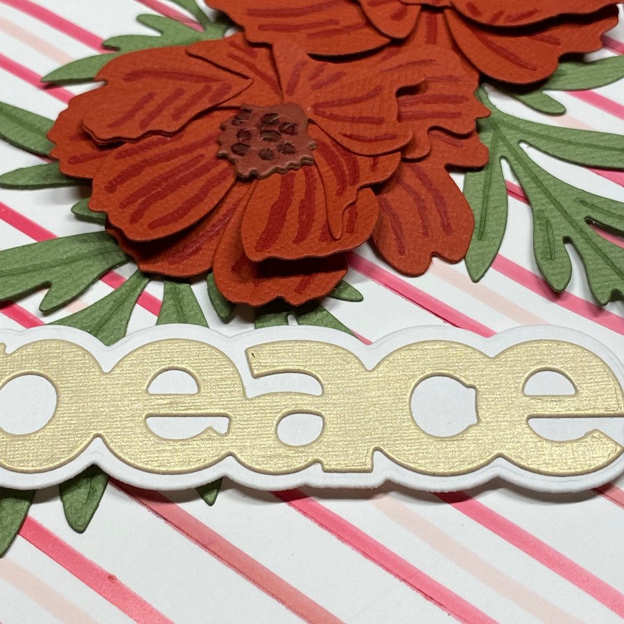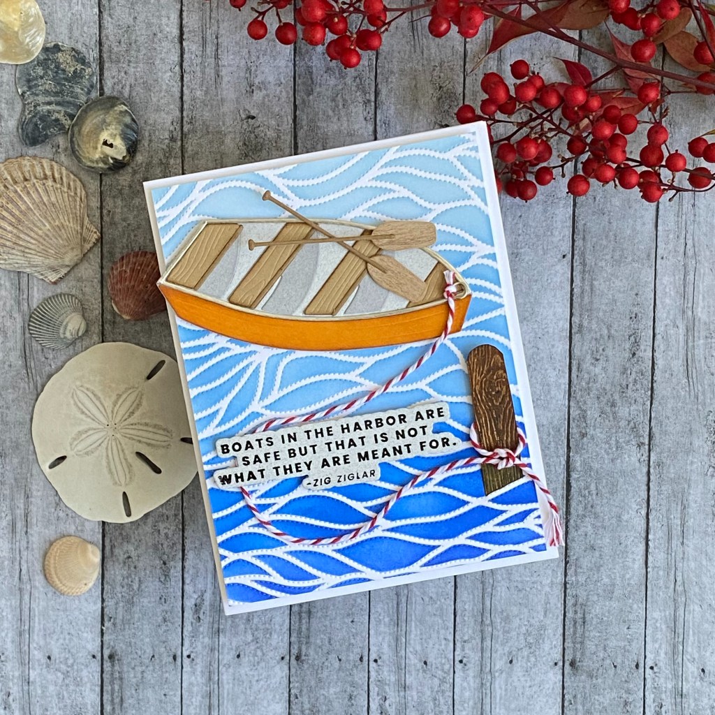 After I put the boat together, I ran a piece of 4.25 by 5.5 inch Neenah Solar White 110 lb cardstock through my Sizzix Big Shot, using the Dotted Waves Debossing Cover Die. I had been eyeing these coverplates that create texture by piercing tiny holes in the paper to create patterns. They’re just so beautiful, and so different than anything I’ve ever seen. Better yet, they won’t add any bulk to a card that is intended to be mailed. This waves pattern is so versatile; it doesn’t have to just be used for waves. It adds so much motion and movement, and only takes a minute to transform a plain piece of cardstock. If I can recommend one product out of this entire challenge, this would definitely be it! For just a few dollars more, go ahead and get the coordinating stencil. You’ll be very happy you did!
