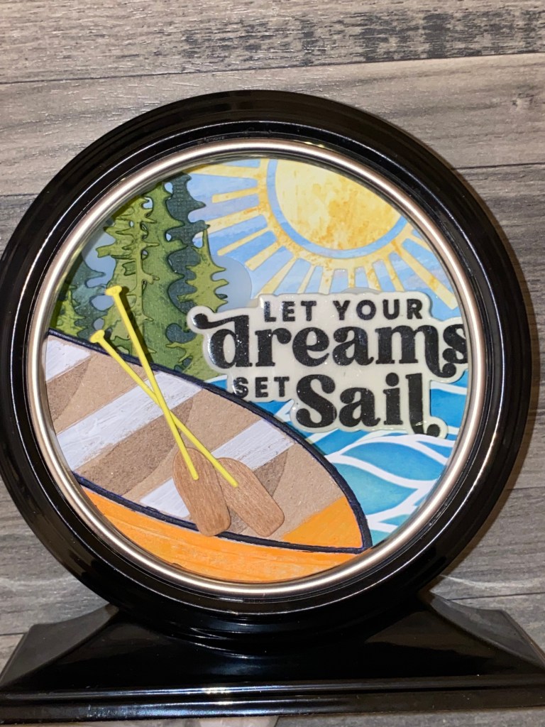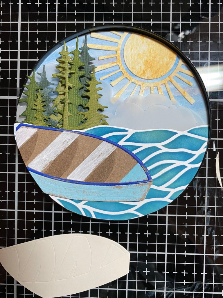 I started by watercoloring a wispy summer sky with the two lighter blues from the Lapis Lazuli ink cube set (Iceberg and Eastern Sky) , along with Pink Pearl and Coral Bliss from the Tea Party ink cube set. I die cut the sun out of a piece of watercolor paper I had in my scrap box. using the Sizzix Circle Play die set again. The paper was most likely made using Distress Scattered Straw ink. I cut three layers of clouds out of vellum, and layered them on to the sky using dimentional tape. To create the trees, I used different shades of green cardstock, which I cut with the Sizzix Forest Shadows die, and added texture with the Tropical Forest ink cube set. I used the Dotted Waves stencil and two Distress Oxide inks (Uncharted Mariner and Bundled Sage) to create the water, so it would be different. It’s hard to tell from the photo, but I have two layers of water… one closer to the back, behind the sentiment, and one in front of the sentiment, directly behind the boat.