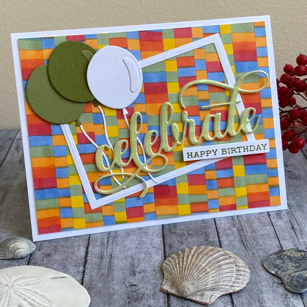 I stamped Happy Birthday for a sub-sentiment from the Sentiment Strips 3 set, using Altenew Moss ink. The balloon die cuts were from an older Tim Holtz set that I have (Circle Play). I just used a few coordinating colors of cardstock from my scrap bin. I cut a thin white frame with rectangular nesting dies, to add a little more interest. It turned out to be a fun card, with lots of dimension and textures!
